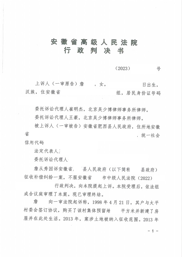 本案代理律師 北京吳少博律師事務(wù)所崔明杰 案情簡(jiǎn)介: 1998年詹女士一家于安徽省某縣安家,